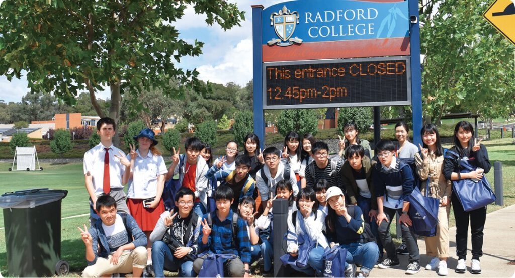 2016年6月にオーストラリアにあるRadford Collegeと姉妹校提携を結びました。2017年9月には、生徒11名と引率教員2名が来校し、授業や部活動体験を行いました。2016年にオーストリアを訪問した本校の生徒たちも懐かしい友達と再会でき、大変有意義な交流が行うことができました。2020年度は新型コロナウイルス感染拡大のため、現地交流ができませんでしたが、中学2年生140名がSkypeを使って現地学生とオンラインで交流しました。